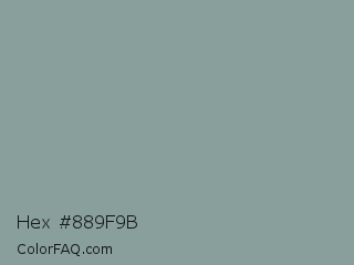 Hex #889f9b Color is a normal cyan color and the nearest color is Granny Smith #84a0a0. Hex code #889f9b and RGB value is rgb(136,159,155). In RGB color space, this color is composed of 53% red, 62% green, 61% blue, In CMYK color space, this color is composed of 14% cyan, 0% magenta, 3% yellow , 38% black , In HSL color space, this color has a hue angle of 170° , 11% saturation and 58% lightness.