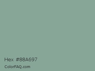 Hex #88a697 Color is a normal green color and the nearest color is Morning Blue #8da399. Hex code #88a697 and RGB value is rgb(136,166,151). In RGB color space, this color is composed of 53% red, 65% green, 59% blue, In CMYK color space, this color is composed of 18% cyan, 0% magenta, 9% yellow , 35% black , In HSL color space, this color has a hue angle of 150° , 14% saturation and 59% lightness.