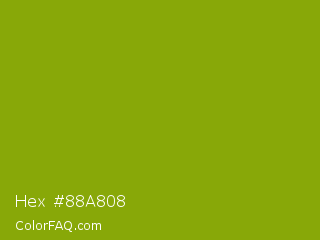 Hex #88a808 Color is a normal lime color and the nearest color is Apple Green #8db600. Hex code #88a808 and RGB value is rgb(136,168,8). In RGB color space, this color is composed of 53% red, 66% green, 3% blue, In CMYK color space, this color is composed of 19% cyan, 0% magenta, 95% yellow , 34% black , In HSL color space, this color has a hue angle of 72° , 91% saturation and 35% lightness.