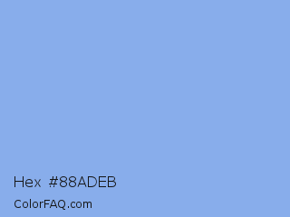 Hex #88adeb Color is a light blue color and the nearest color is Light Cobalt Blue #88ace0. Hex code #88adeb and RGB value is rgb(136,173,235). In RGB color space, this color is composed of 53% red, 68% green, 92% blue, In CMYK color space, this color is composed of 42% cyan, 26% magenta, 0% yellow , 8% black , In HSL color space, this color has a hue angle of 218° , 71% saturation and 73% lightness.