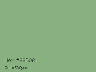 Hex #88b081 Color is a normal green color and the nearest color is Bay Leaf #7da98d. Hex code #88b081 and RGB value is rgb(136,176,129). In RGB color space, this color is composed of 53% red, 69% green, 51% blue, In CMYK color space, this color is composed of 23% cyan, 0% magenta, 27% yellow , 31% black , In HSL color space, this color has a hue angle of 111° , 23% saturation and 60% lightness.