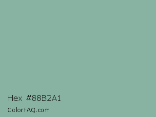 Hex #88b2a1 Color is a light green color and the nearest color is Cascade #8ba9a5. Hex code #88b2a1 and RGB value is rgb(136,178,161). In RGB color space, this color is composed of 53% red, 70% green, 63% blue, In CMYK color space, this color is composed of 24% cyan, 0% magenta, 10% yellow , 30% black , In HSL color space, this color has a hue angle of 156° , 21% saturation and 62% lightness.