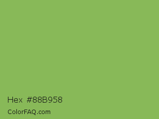 Hex #88b958 Color is a normal green color and the nearest color is Dollar Bill #85bb65. Hex code #88b958 and RGB value is rgb(136,185,88). In RGB color space, this color is composed of 53% red, 73% green, 35% blue, In CMYK color space, this color is composed of 26% cyan, 0% magenta, 52% yellow , 27% black , In HSL color space, this color has a hue angle of 90° , 41% saturation and 54% lightness.