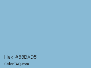Hex #88bad5 Color is a light blue color and the nearest color is Dark Sky Blue #8cbed6. Hex code #88bad5 and RGB value is rgb(136,186,213). In RGB color space, this color is composed of 53% red, 73% green, 84% blue, In CMYK color space, this color is composed of 36% cyan, 13% magenta, 0% yellow , 16% black , In HSL color space, this color has a hue angle of 201° , 48% saturation and 68% lightness.