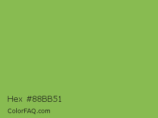 Hex #88bb51 Color is a normal green color and the nearest color is Dollar Bill #85bb65. Hex code #88bb51 and RGB value is rgb(136,187,81). In RGB color space, this color is composed of 53% red, 73% green, 32% blue, In CMYK color space, this color is composed of 27% cyan, 0% magenta, 57% yellow , 27% black , In HSL color space, this color has a hue angle of 89° , 44% saturation and 53% lightness.
