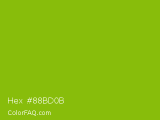 Hex #88bd0b Color is a normal lime color and the nearest color is Apple Green #8db600. Hex code #88bd0b and RGB value is rgb(136,189,11). In RGB color space, this color is composed of 53% red, 74% green, 4% blue, In CMYK color space, this color is composed of 28% cyan, 0% magenta, 94% yellow , 26% black , In HSL color space, this color has a hue angle of 78° , 89% saturation and 39% lightness.