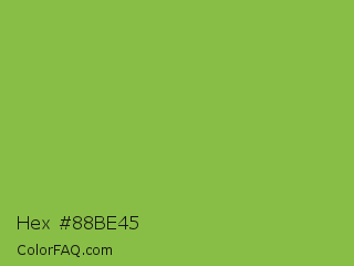 Hex #88be45 Color is a normal green color and the nearest color is Sushi #87ab39. Hex code #88be45 and RGB value is rgb(136,190,69). In RGB color space, this color is composed of 53% red, 75% green, 27% blue, In CMYK color space, this color is composed of 28% cyan, 0% magenta, 64% yellow , 25% black , In HSL color space, this color has a hue angle of 87° , 48% saturation and 51% lightness.