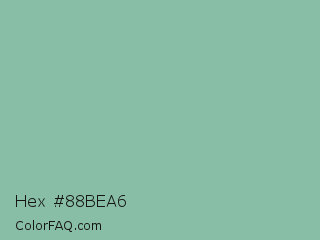 Hex #88bea6 Color is a light green color and the nearest color is Summer Green #96bbab. Hex code #88bea6 and RGB value is rgb(136,190,166). In RGB color space, this color is composed of 53% red, 75% green, 65% blue, In CMYK color space, this color is composed of 28% cyan, 0% magenta, 13% yellow , 25% black , In HSL color space, this color has a hue angle of 153° , 29% saturation and 64% lightness.