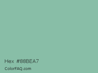 Hex #88bea7 Color is a light green color and the nearest color is Summer Green #96bbab. Hex code #88bea7 and RGB value is rgb(136,190,167). In RGB color space, this color is composed of 53% red, 75% green, 65% blue, In CMYK color space, this color is composed of 28% cyan, 0% magenta, 12% yellow , 25% black , In HSL color space, this color has a hue angle of 154° , 29% saturation and 64% lightness.