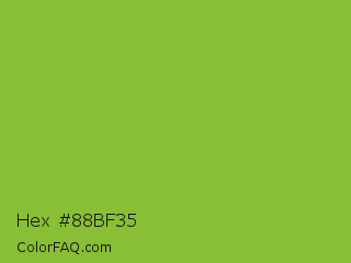 Hex #88bf35 Color is a normal green color and the nearest color is Sushi #87ab39. Hex code #88bf35 and RGB value is rgb(136,191,53). In RGB color space, this color is composed of 53% red, 75% green, 21% blue, In CMYK color space, this color is composed of 29% cyan, 0% magenta, 72% yellow , 25% black , In HSL color space, this color has a hue angle of 84° , 57% saturation and 48% lightness.