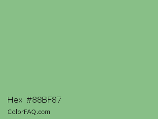 Hex #88bf87 Color is a light green color and the nearest color is Dark Sea Green #8fbc8f. Hex code #88bf87 and RGB value is rgb(136,191,135). In RGB color space, this color is composed of 53% red, 75% green, 53% blue, In CMYK color space, this color is composed of 29% cyan, 0% magenta, 29% yellow , 25% black , In HSL color space, this color has a hue angle of 119° , 30% saturation and 64% lightness.