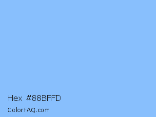 Hex #88bffd Color is a light blue color and the nearest color is Jordy Blue #8ab9f1. Hex code #88bffd and RGB value is rgb(136,191,253). In RGB color space, this color is composed of 53% red, 75% green, 99% blue, In CMYK color space, this color is composed of 46% cyan, 25% magenta, 0% yellow , 1% black , In HSL color space, this color has a hue angle of 212° , 97% saturation and 76% lightness.