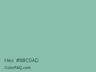 Hex #88c0ad Color is a light green color and the nearest color is Summer Green #96bbab. Hex code #88c0ad and RGB value is rgb(136,192,173). In RGB color space, this color is composed of 53% red, 75% green, 68% blue, In CMYK color space, this color is composed of 29% cyan, 0% magenta, 10% yellow , 25% black , In HSL color space, this color has a hue angle of 160° , 31% saturation and 64% lightness.