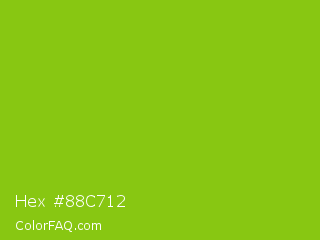 Hex #88c712 Color is a normal green color and the nearest color is Lima #76bd17. Hex code #88c712 and RGB value is rgb(136,199,18). In RGB color space, this color is composed of 53% red, 78% green, 7% blue, In CMYK color space, this color is composed of 32% cyan, 0% magenta, 91% yellow , 22% black , In HSL color space, this color has a hue angle of 81° , 83% saturation and 43% lightness.