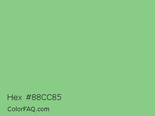 Hex #88cc85 Color is a light green color and the nearest color is De York #7ac488. Hex code #88cc85 and RGB value is rgb(136,204,133). In RGB color space, this color is composed of 53% red, 80% green, 52% blue, In CMYK color space, this color is composed of 33% cyan, 0% magenta, 35% yellow , 20% black , In HSL color space, this color has a hue angle of 117° , 41% saturation and 66% lightness.