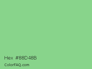 Hex #88d48b Color is a light green color and the nearest color is De York #7ac488. Hex code #88d48b and RGB value is rgb(136,212,139). In RGB color space, this color is composed of 53% red, 83% green, 55% blue, In CMYK color space, this color is composed of 36% cyan, 0% magenta, 34% yellow , 17% black , In HSL color space, this color has a hue angle of 122° , 47% saturation and 68% lightness.