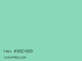 Hex #88d9bb Color is a light green color and the nearest color is Pearl Aqua #88d8c0. Hex code #88d9bb and RGB value is rgb(136,217,187). In RGB color space, this color is composed of 53% red, 85% green, 73% blue, In CMYK color space, this color is composed of 37% cyan, 0% magenta, 14% yellow , 15% black , In HSL color space, this color has a hue angle of 158° , 52% saturation and 69% lightness.