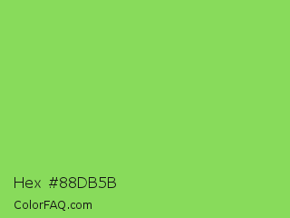 Hex #88db5b Color is a light green color and the nearest color is Kiwi #8ee53f. Hex code #88db5b and RGB value is rgb(136,219,91). In RGB color space, this color is composed of 53% red, 86% green, 36% blue, In CMYK color space, this color is composed of 38% cyan, 0% magenta, 58% yellow , 14% black , In HSL color space, this color has a hue angle of 99° , 64% saturation and 61% lightness.