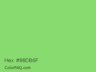 Hex #88db6f Color is a light green color and the nearest color is Pastel Green #77dd77. Hex code #88db6f and RGB value is rgb(136,219,111). In RGB color space, this color is composed of 53% red, 86% green, 44% blue, In CMYK color space, this color is composed of 38% cyan, 0% magenta, 49% yellow , 14% black , In HSL color space, this color has a hue angle of 106° , 60% saturation and 65% lightness.
