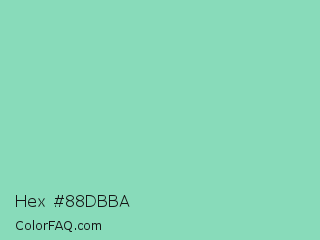 Hex #88dbba Color is a light green color and the nearest color is Pearl Aqua #88d8c0. Hex code #88dbba and RGB value is rgb(136,219,186). In RGB color space, this color is composed of 53% red, 86% green, 73% blue, In CMYK color space, this color is composed of 38% cyan, 0% magenta, 15% yellow , 14% black , In HSL color space, this color has a hue angle of 156° , 54% saturation and 70% lightness.