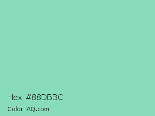 Hex #88dbbc Color is a light green color and the nearest color is Pearl Aqua #88d8c0. Hex code #88dbbc and RGB value is rgb(136,219,188). In RGB color space, this color is composed of 53% red, 86% green, 74% blue, In CMYK color space, this color is composed of 38% cyan, 0% magenta, 14% yellow , 14% black , In HSL color space, this color has a hue angle of 158° , 54% saturation and 70% lightness.