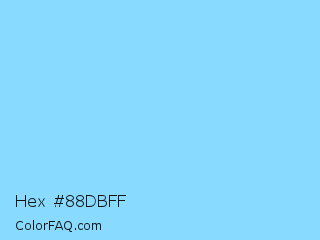 Hex #88dbff Color is a light blue color and the nearest color is Pale Cyan #87d3f8. Hex code #88dbff and RGB value is rgb(136,219,255). In RGB color space, this color is composed of 53% red, 86% green, 100% blue, In CMYK color space, this color is composed of 47% cyan, 14% magenta, 0% yellow , 0% black , In HSL color space, this color has a hue angle of 198° , 100% saturation and 77% lightness.