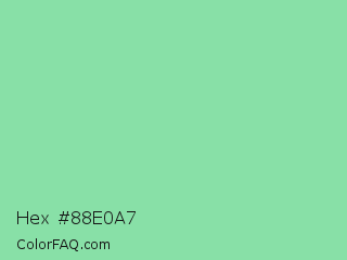 Hex #88e0a7 Color is a light green color and the nearest color is Vista Blue #8fd6b4. Hex code #88e0a7 and RGB value is rgb(136,224,167). In RGB color space, this color is composed of 53% red, 88% green, 65% blue, In CMYK color space, this color is composed of 39% cyan, 0% magenta, 25% yellow , 12% black , In HSL color space, this color has a hue angle of 141° , 59% saturation and 71% lightness.