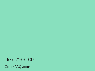 Hex #88e0be Color is a light green color and the nearest color is Pearl Aqua #88d8c0. Hex code #88e0be and RGB value is rgb(136,224,190). In RGB color space, this color is composed of 53% red, 88% green, 75% blue, In CMYK color space, this color is composed of 39% cyan, 0% magenta, 15% yellow , 12% black , In HSL color space, this color has a hue angle of 157° , 59% saturation and 71% lightness.