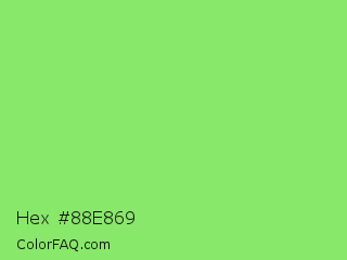 Hex #88e869 Color is a light green color and the nearest color is Pastel Green #77dd77. Hex code #88e869 and RGB value is rgb(136,232,105). In RGB color space, this color is composed of 53% red, 91% green, 41% blue, In CMYK color space, this color is composed of 41% cyan, 0% magenta, 55% yellow , 9% black , In HSL color space, this color has a hue angle of 105° , 73% saturation and 66% lightness.
