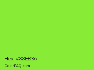 Hex #88eb36 Color is a normal green color and the nearest color is Kiwi #8ee53f. Hex code #88eb36 and RGB value is rgb(136,235,54). In RGB color space, this color is composed of 53% red, 92% green, 21% blue, In CMYK color space, this color is composed of 42% cyan, 0% magenta, 77% yellow , 8% black , In HSL color space, this color has a hue angle of 93° , 82% saturation and 57% lightness.