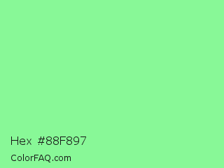 Hex #88f897 Color is a light green color and the nearest color is Light Green #90ee90. Hex code #88f897 and RGB value is rgb(136,248,151). In RGB color space, this color is composed of 53% red, 97% green, 59% blue, In CMYK color space, this color is composed of 45% cyan, 0% magenta, 39% yellow , 3% black , In HSL color space, this color has a hue angle of 128° , 89% saturation and 75% lightness.