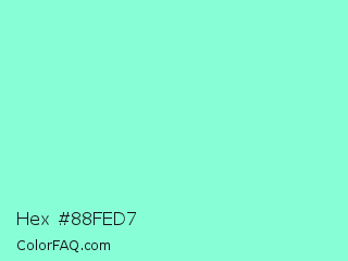 Hex #88fed7 Color is a light green color and the nearest color is Aquamarine #7fffd4. Hex code #88fed7 and RGB value is rgb(136,254,215). In RGB color space, this color is composed of 53% red, 100% green, 84% blue, In CMYK color space, this color is composed of 46% cyan, 0% magenta, 15% yellow , 0% black , In HSL color space, this color has a hue angle of 160° , 98% saturation and 76% lightness.