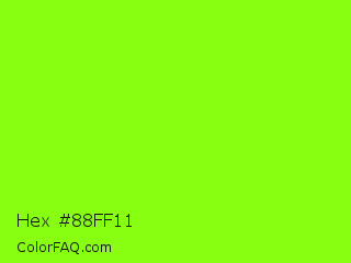 Hex #88ff11 Color is a normal green color and the nearest color is Chartreuse #7fff00. Hex code #88ff11 and RGB value is rgb(136,255,17). In RGB color space, this color is composed of 53% red, 100% green, 7% blue, In CMYK color space, this color is composed of 47% cyan, 0% magenta, 93% yellow , 0% black , In HSL color space, this color has a hue angle of 90° , 100% saturation and 53% lightness.