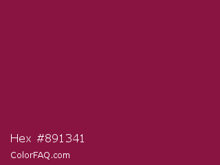 Hex #891341 Color is a normal rose color and the nearest color is Rose Bud Cherry #800b47. Hex code #891341 and RGB value is rgb(137,19,65). In RGB color space, this color is composed of 54% red, 7% green, 25% blue, In CMYK color space, this color is composed of 0% cyan, 86% magenta, 53% yellow , 46% black , In HSL color space, this color has a hue angle of 337° , 76% saturation and 31% lightness.
