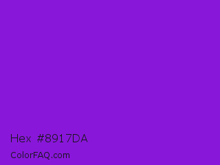 Hex #8917da Color is a normal purple color and the nearest color is French Violet #8806ce. Hex code #8917da and RGB value is rgb(137,23,218). In RGB color space, this color is composed of 54% red, 9% green, 85% blue, In CMYK color space, this color is composed of 37% cyan, 89% magenta, 0% yellow , 15% black , In HSL color space, this color has a hue angle of 275° , 81% saturation and 47% lightness.