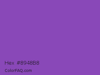Hex #8948b8 Color is a normal purple color and the nearest color is Purpureus #9a4eae. Hex code #8948b8 and RGB value is rgb(137,72,184). In RGB color space, this color is composed of 54% red, 28% green, 72% blue, In CMYK color space, this color is composed of 26% cyan, 61% magenta, 0% yellow , 28% black , In HSL color space, this color has a hue angle of 275° , 44% saturation and 50% lightness.