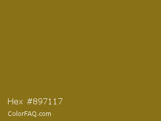 Hex #897117 Color is a normal yellow color and the nearest color is Sand Dune #967117. Hex code #897117 and RGB value is rgb(137,113,23). In RGB color space, this color is composed of 54% red, 44% green, 9% blue, In CMYK color space, this color is composed of 0% cyan, 18% magenta, 83% yellow , 46% black , In HSL color space, this color has a hue angle of 47° , 71% saturation and 31% lightness.