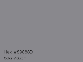 Hex #89888d Color is a normal indigo color and the nearest color is Taupe Gray #8b8589. Hex code #89888d and RGB value is rgb(137,136,141). In RGB color space, this color is composed of 54% red, 53% green, 55% blue, In CMYK color space, this color is composed of 3% cyan, 4% magenta, 0% yellow , 45% black , In HSL color space, this color has a hue angle of 252° , 2% saturation and 54% lightness.