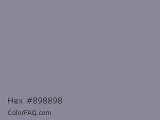Hex #898898 Color is a normal indigo color and the nearest color is Roman Silver #838996. Hex code #898898 and RGB value is rgb(137,136,152). In RGB color space, this color is composed of 54% red, 53% green, 60% blue, In CMYK color space, this color is composed of 10% cyan, 11% magenta, 0% yellow , 40% black , In HSL color space, this color has a hue angle of 244° , 7% saturation and 56% lightness.