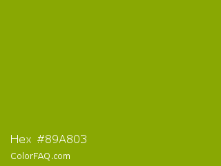 Hex #89a803 Color is a normal lime color and the nearest color is Apple Green #8db600. Hex code #89a803 and RGB value is rgb(137,168,3). In RGB color space, this color is composed of 54% red, 66% green, 1% blue, In CMYK color space, this color is composed of 18% cyan, 0% magenta, 98% yellow , 34% black , In HSL color space, this color has a hue angle of 71° , 96% saturation and 34% lightness.
