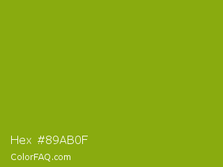 Hex #89ab0f Color is a normal lime color and the nearest color is Apple Green #8db600. Hex code #89ab0f and RGB value is rgb(137,171,15). In RGB color space, this color is composed of 54% red, 67% green, 6% blue, In CMYK color space, this color is composed of 20% cyan, 0% magenta, 91% yellow , 33% black , In HSL color space, this color has a hue angle of 73° , 84% saturation and 36% lightness.