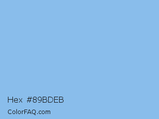 Hex #89bdeb Color is a light blue color and the nearest color is Jordy Blue #8ab9f1. Hex code #89bdeb and RGB value is rgb(137,189,235). In RGB color space, this color is composed of 54% red, 74% green, 92% blue, In CMYK color space, this color is composed of 42% cyan, 20% magenta, 0% yellow , 8% black , In HSL color space, this color has a hue angle of 208° , 71% saturation and 73% lightness.