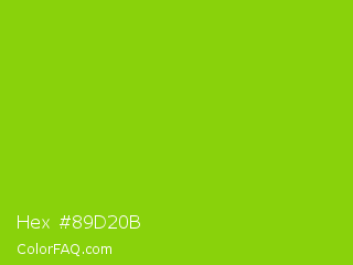 Hex #89d20b Color is a normal green color and the nearest color is Sheen Green #8fd400. Hex code #89d20b and RGB value is rgb(137,210,11). In RGB color space, this color is composed of 54% red, 82% green, 4% blue, In CMYK color space, this color is composed of 35% cyan, 0% magenta, 95% yellow , 18% black , In HSL color space, this color has a hue angle of 82° , 90% saturation and 43% lightness.