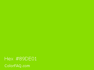 Hex #89de01 Color is a normal green color and the nearest color is Alien Armpit #84de02. Hex code #89de01 and RGB value is rgb(137,222,1). In RGB color space, this color is composed of 54% red, 87% green, 0% blue, In CMYK color space, this color is composed of 38% cyan, 0% magenta, 100% yellow , 13% black , In HSL color space, this color has a hue angle of 83° , 99% saturation and 44% lightness.