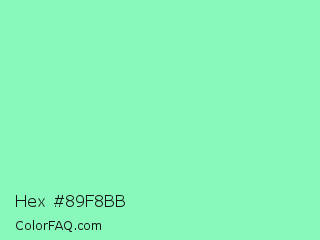 Hex #89f8bb Color is a light green color and the nearest color is Teal Deer #99e6b3. Hex code #89f8bb and RGB value is rgb(137,248,187). In RGB color space, this color is composed of 54% red, 97% green, 73% blue, In CMYK color space, this color is composed of 45% cyan, 0% magenta, 25% yellow , 3% black , In HSL color space, this color has a hue angle of 147° , 89% saturation and 75% lightness.