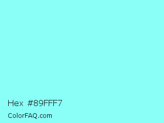 Hex #89fff7 Color is a light cyan color and the nearest color is Electric Blue #7df9ff. Hex code #89fff7 and RGB value is rgb(137,255,247). In RGB color space, this color is composed of 54% red, 100% green, 97% blue, In CMYK color space, this color is composed of 46% cyan, 0% magenta, 3% yellow , 0% black , In HSL color space, this color has a hue angle of 176° , 100% saturation and 77% lightness.