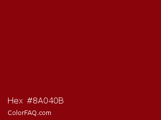 Hex #8a040b Color is a dark red color and the nearest color is Red Devil #860111. Hex code #8a040b and RGB value is rgb(138,4,11). In RGB color space, this color is composed of 54% red, 2% green, 4% blue, In CMYK color space, this color is composed of 0% cyan, 97% magenta, 92% yellow , 46% black , In HSL color space, this color has a hue angle of 357° , 94% saturation and 28% lightness.