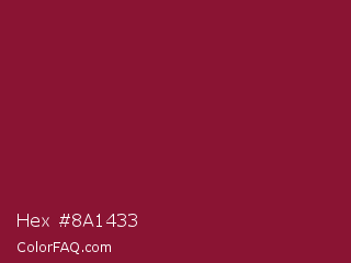 Hex #8a1433 Color is a normal rose color and the nearest color is Antique Ruby #841b2d. Hex code #8a1433 and RGB value is rgb(138,20,51). In RGB color space, this color is composed of 54% red, 8% green, 20% blue, In CMYK color space, this color is composed of 0% cyan, 86% magenta, 63% yellow , 46% black , In HSL color space, this color has a hue angle of 344° , 75% saturation and 31% lightness.