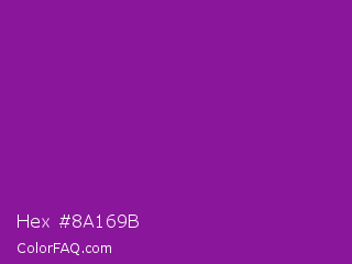 Hex #8a169b Color is a normal magenta color and the nearest color is Violet Eggplant #991199. Hex code #8a169b and RGB value is rgb(138,22,155). In RGB color space, this color is composed of 54% red, 9% green, 61% blue, In CMYK color space, this color is composed of 11% cyan, 86% magenta, 0% yellow , 39% black , In HSL color space, this color has a hue angle of 292° , 75% saturation and 35% lightness.