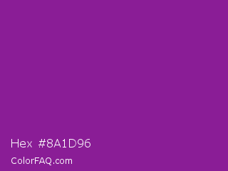 Hex #8a1d96 Color is a normal magenta color and the nearest color is Violet Eggplant #991199. Hex code #8a1d96 and RGB value is rgb(138,29,150). In RGB color space, this color is composed of 54% red, 11% green, 59% blue, In CMYK color space, this color is composed of 8% cyan, 81% magenta, 0% yellow , 41% black , In HSL color space, this color has a hue angle of 294° , 68% saturation and 35% lightness.